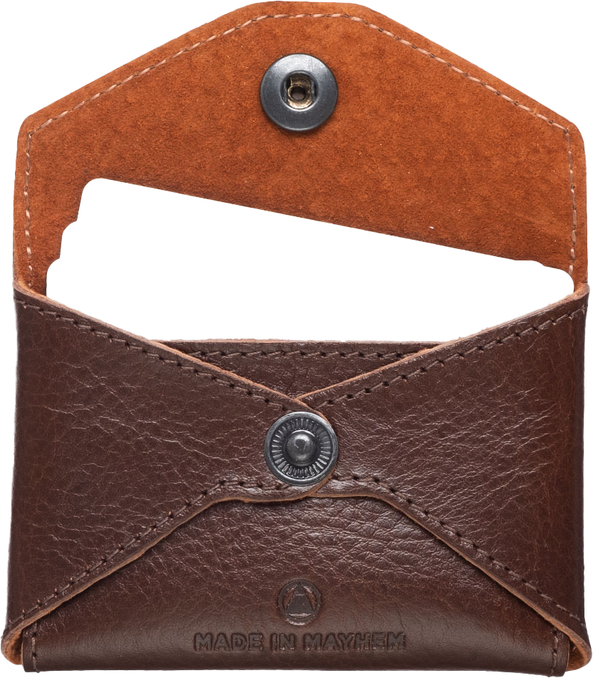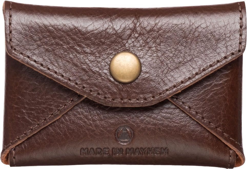This elegant and minimalist coin or business card holder will be sure to make a statement. Lined with suede and a metal snap closure on the front. This rich whiskey brown leather has a great hand feel and will get a beautiful worn look with time.